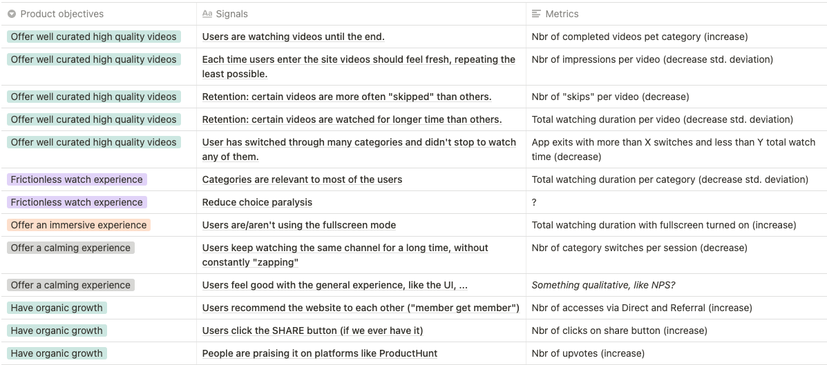 The product metrics were inspired by the HEART framework, but instead of using regular dimensions such as Adoption, Engagement, … we used our own product goals as dimensions for thinking and organizing the different signals and metrics. These were implemented using the new Google Analytics 4, which has a brand new events system.