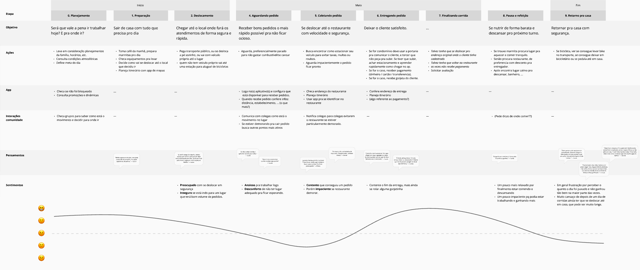 Right after joining the project I planned and conducted in-depth interviews with delivery workers from across Brazil to deepen that understanding. Our sample included both bicycle and motorcycle riders from different regions of the country, ages and genders. We wanted to have a clear picture of how a typical day for them looks like, and we focused on the challenges they faced. We also tried to understand their networks, consumption of content related to delivery, and their financial organization. Finally, we invited them to zoom out and understand how they got there and what were their medium and long term goals.