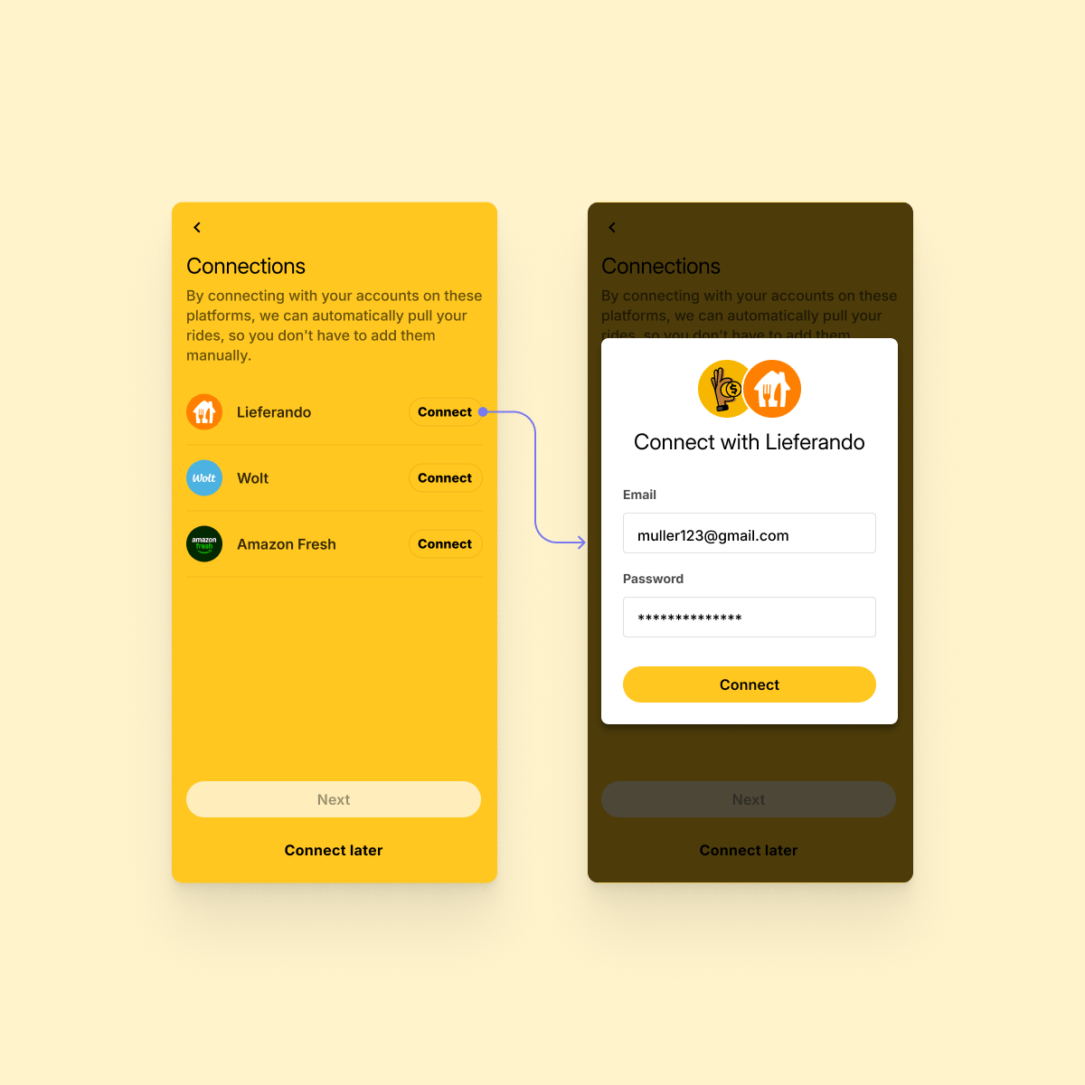 Automatically import rides’ data from different delivery platforms. A highly requested feature since the first research, this feature proved to be way too costly for our MVP, but after the launch we’ll seek funding to implement it.